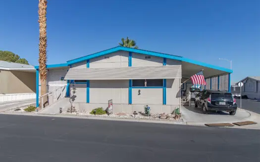 1670 sq. ft. triple-wide 3 bedroom 2 bathroom mobile home For Sale in Flamingo West 55+ Gated Manufactured Home Community – 8122 W. Flamingo Rd. Las Vegas, NV 89147. This home is located on a corner home-site with low maintenance landscaping. It has a full-length carport with a matching shed at the end of the driveway. It also has a covered semi-private front deck that is perfect for relaxation or entertaining.